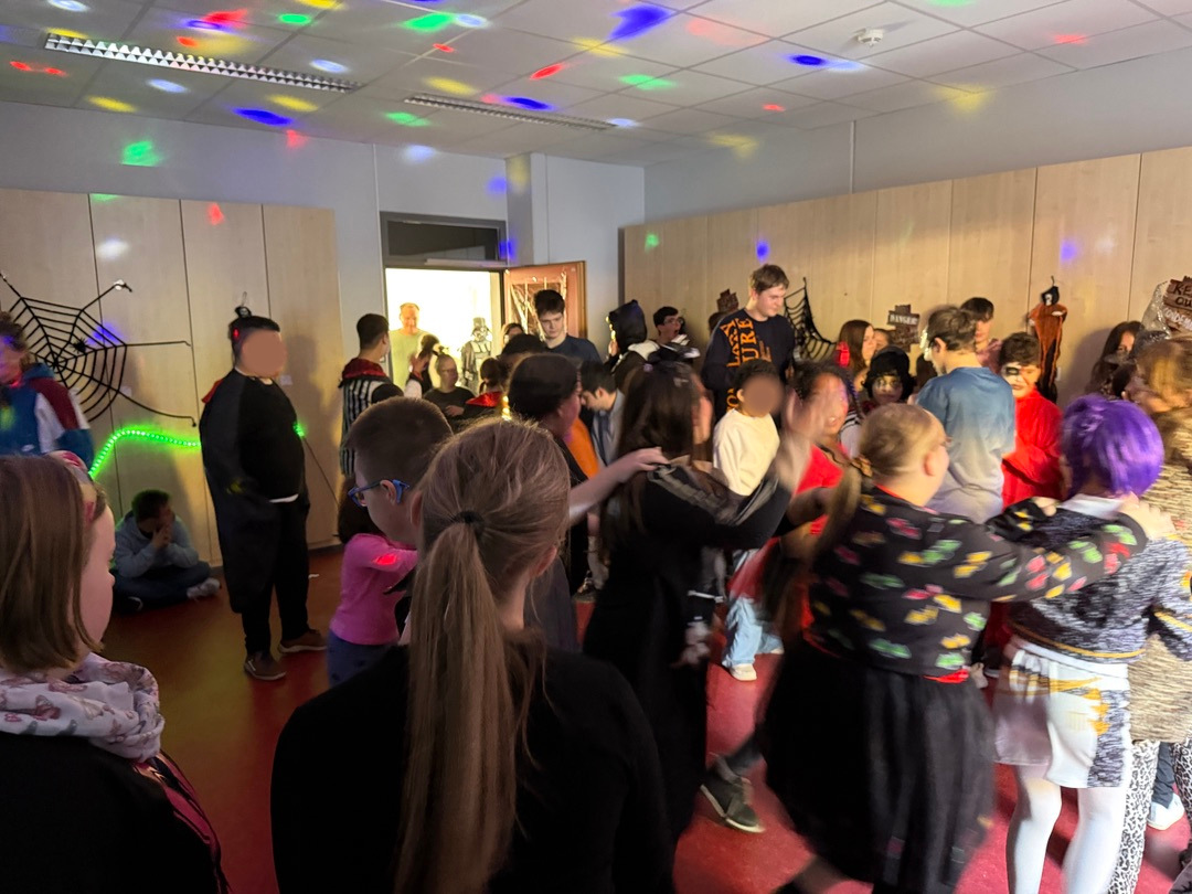 Heute hat die Klasse MO4 den Musikraum gruselig dekoriert und alle MO Klassen zu einer Halloween-Disko eingeladen. Viele kamen verkleidet und es wurde zu cooler Musik getanzt.