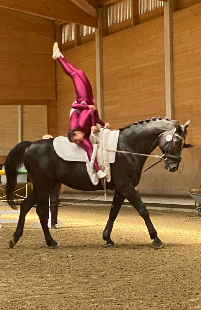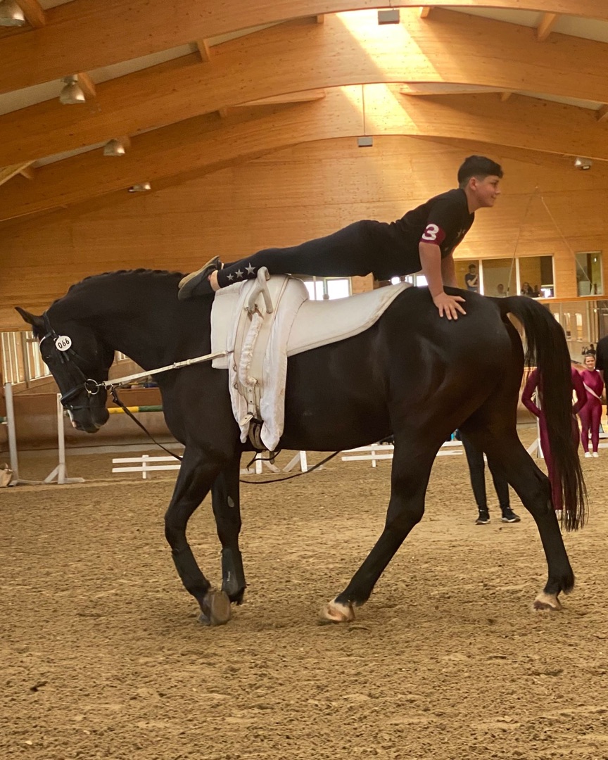 Unser Training umfasst die sogenannte Bodenarbeit rund ums Pferd: Stallausmisten, Pferdepflege, „Anziehen“ und Führen des Pferdes. Hinzu kommen turnerische Übungen auf dem Holzpferd sowie dem elektrischen Übungspferd in den Gangarten Schritt und Galopp, die im Rahmen des Voltigier-Pflichtprogrammes auf Turnieren und bei Schauveranstaltungen gezeigt und gewertet werden.